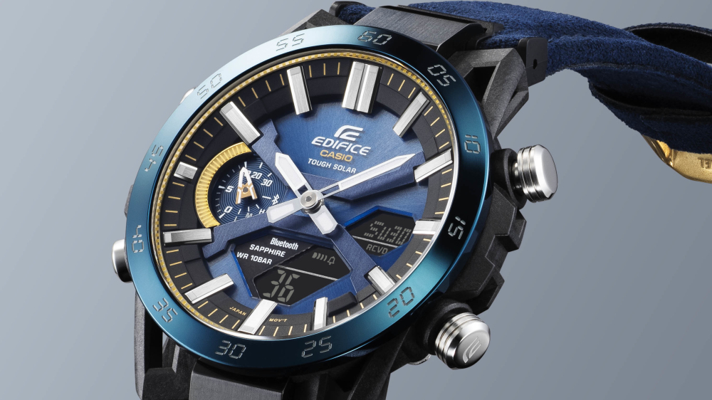 强调速度与智能的金属指针男表edifice系列此次推出了ecb-2000ss-2a,其基础型号ecb-2000的悬挂臂设计令人印象深刻,此次搭配深邃蓝色与耀目金色尽显奢感,不凡品味轻松呈现。