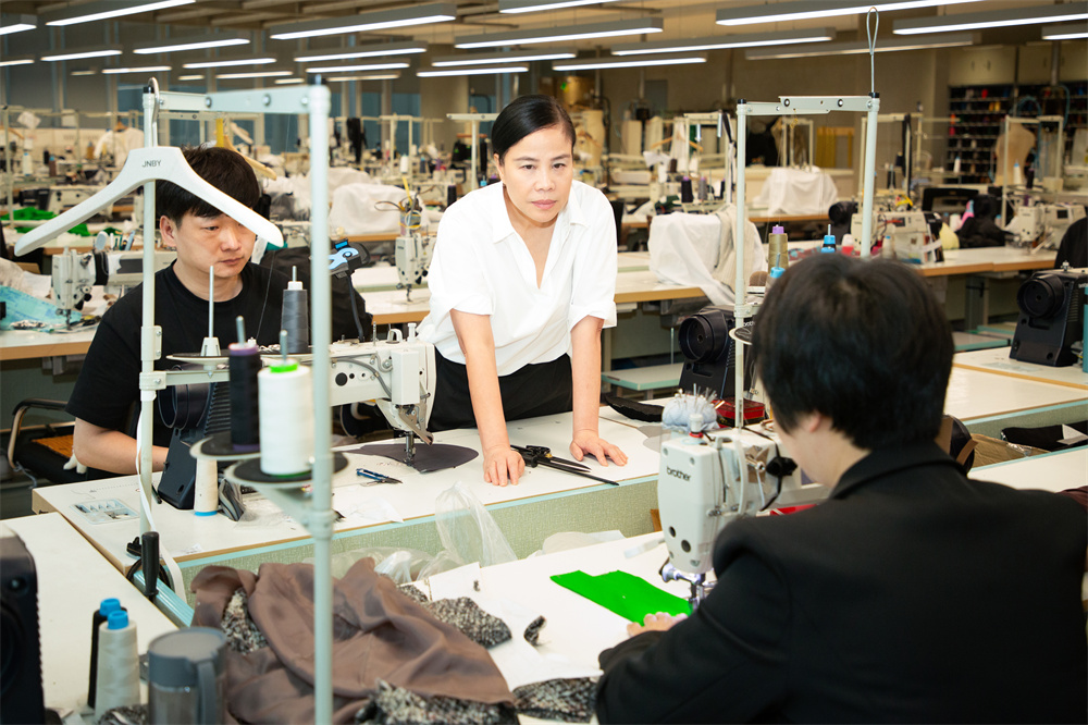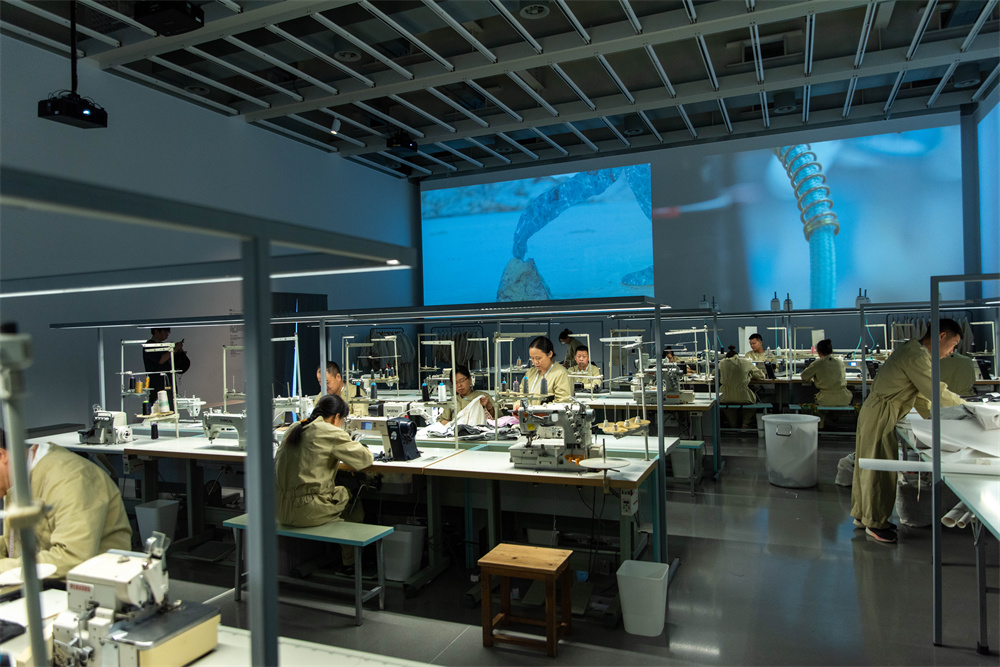 1号展厅——布衣拼图由放大的服装“裁片”组成,每一块“裁片”中都陈列着江南布衣的历史文献,从不同角度讲述江南布衣关于时光的叙事;2号展厅——劳动者中,样衣车间被艺术化地复刻于此,工人师傅的身影与艺术家镜头下的影像交织,让观众直观见证每一件成衣背后的信念与坚守。