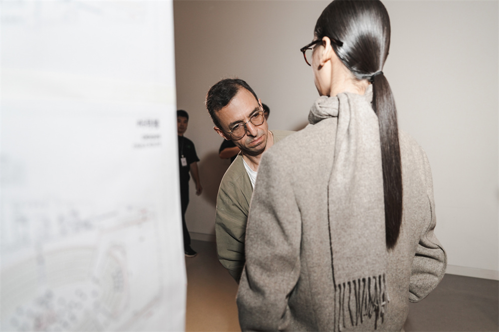 江南布衣特别邀请西班牙当代艺术家felipe pantone,为秀场打造了巨型艺术装置——《多维色彩动力学》(chromadynamica dimensional) 。felipe pantone受当代数字社会的速度与美学的启发,结合几何形状、像素化等数字化视觉美学,恢复数字时代下所生成图像的触觉价值。他本次创作的大型互动公共装置以构成“无限”的圆为灵感,采用多种耐用材料,呈现出精致工艺和现代感,结合此次江南布衣三十周年“生于独到,立于多元”的主题,felipe pantone通过色彩渐变的位移创造出丰富的感官体验,让色彩自由碰撞,敞开未来的无限可能性,更通过观众的互动参与,增强了艺术与公众之间的联结。