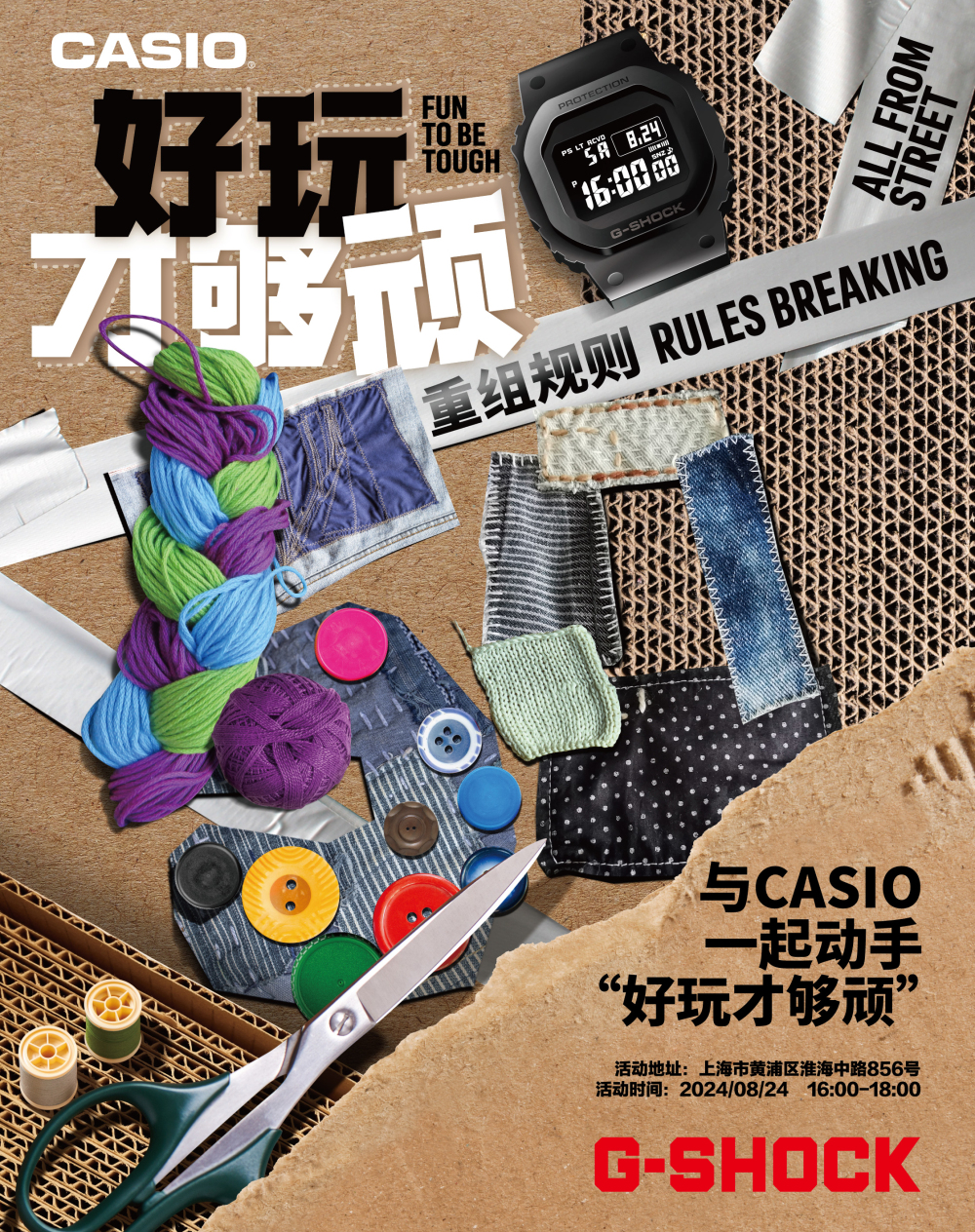 8月24日,【好玩才够顽 · 重组规则】 workshop 于上海淮海中路g-shock store成功开展,g-shock通过设计充满创意的“来自街头”凯发棋牌的线下活动邀请潮流达人到场打卡,通过环保拼贴创作活动,让g-shock store成为了轻松有趣的潮流工坊。