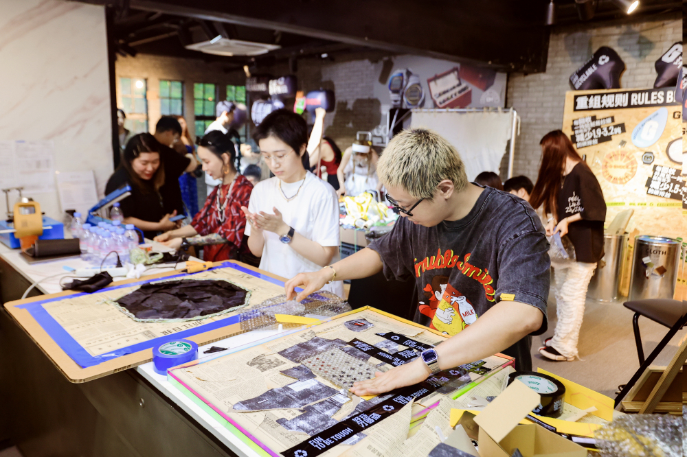 对谈结束后,现场邀请的潮流达人在颜程run和孙佳艺的带领下,用废弃的包装与衣服开始了主题拼贴创作,不同材质的物料在相互组合碰撞中重组规则,演绎街头潮流的无限可能。