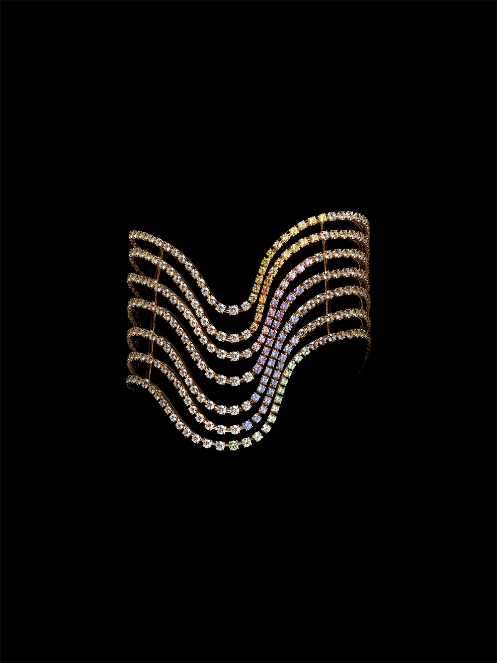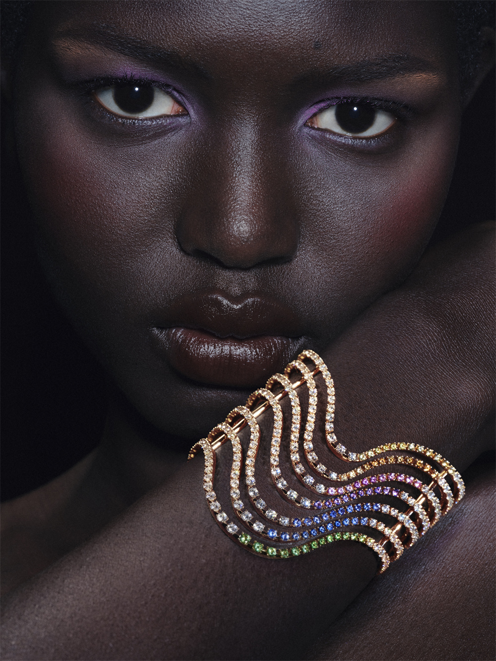 “缤纷如虹”拥有如波流动的灵活形态,完美贴合身姿曲线,柔美色彩就像梦境的召唤。手环与项链采用巧夺天工的铰接构造,堪称凝聚品牌创举的工艺结晶。近1400颗宝石经仔细甄选,用于呈现项链的渐变色彩。