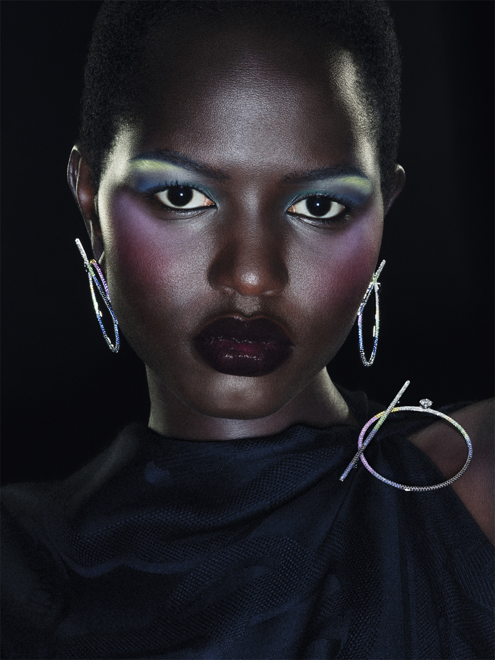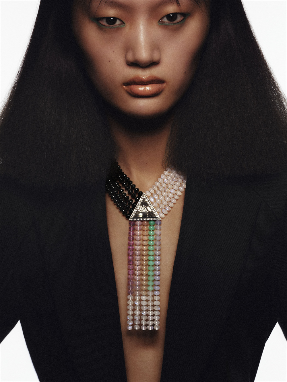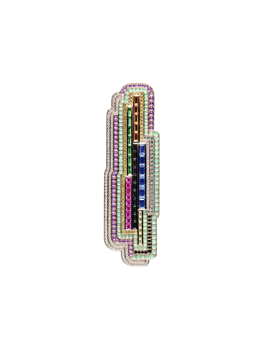 “色彩的形状”催生大胆的邂逅,激发鲜明的反差,创造动人的惊喜:在“斑斓氛围”一章中,圆润廓形与不对称造型大胆结合,巧妙衬托采用经典切工的珍贵宝石,如祖母绿形切割祖母绿,或长方形切割坦桑石。“彩色快门”则极富几何美感,每款作品均铺镶色彩明艳的宝石,好似像素感分明的数码图片。项链采用独具一格的革新构造,让长度随心变换,带来丰富多样的佩戴方式。