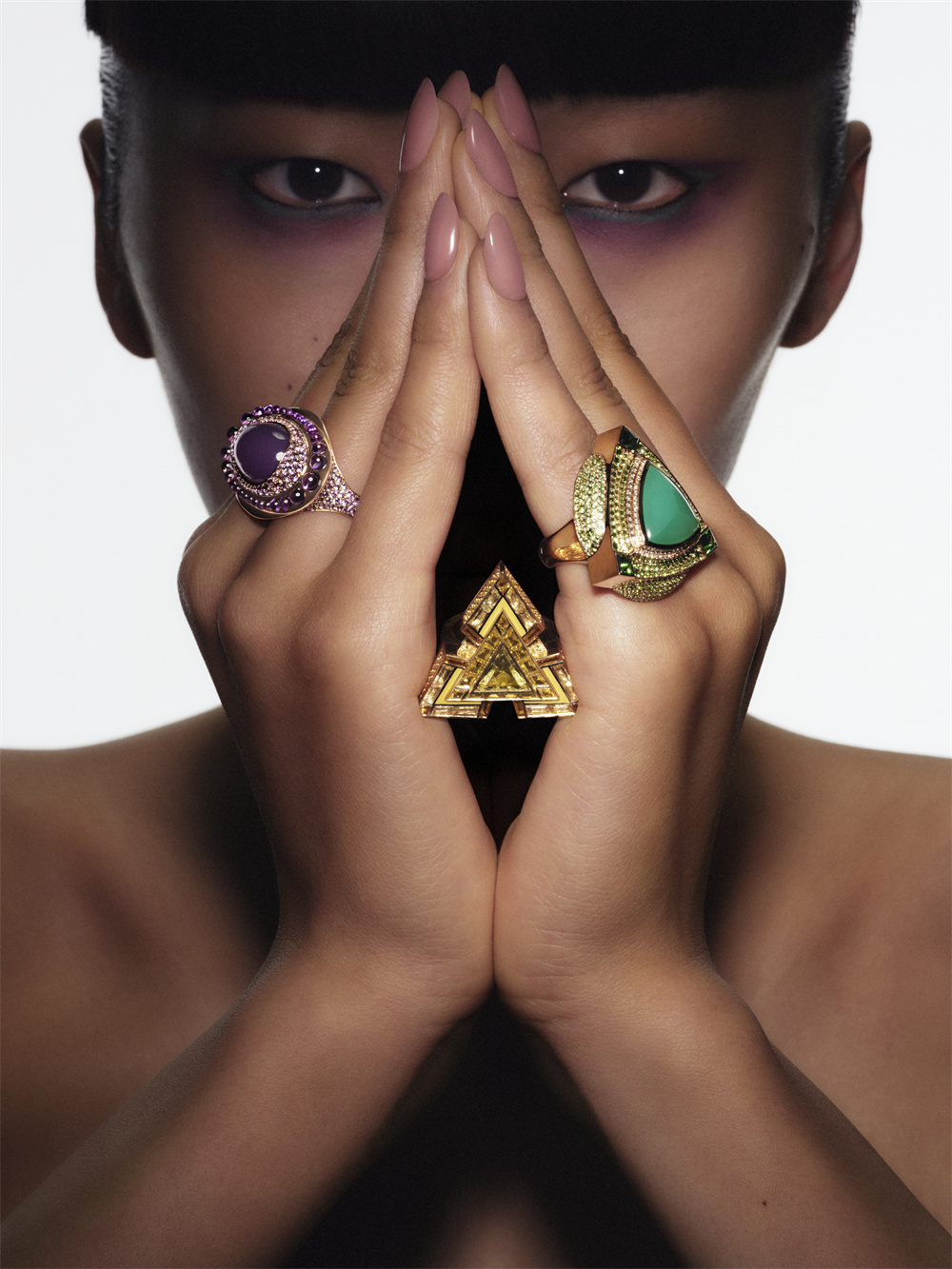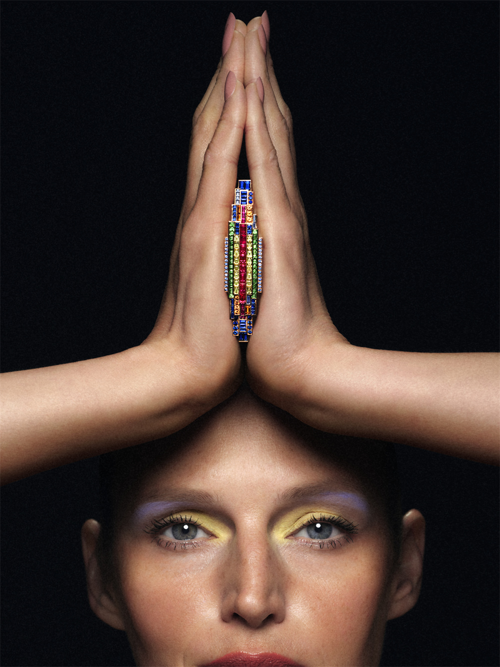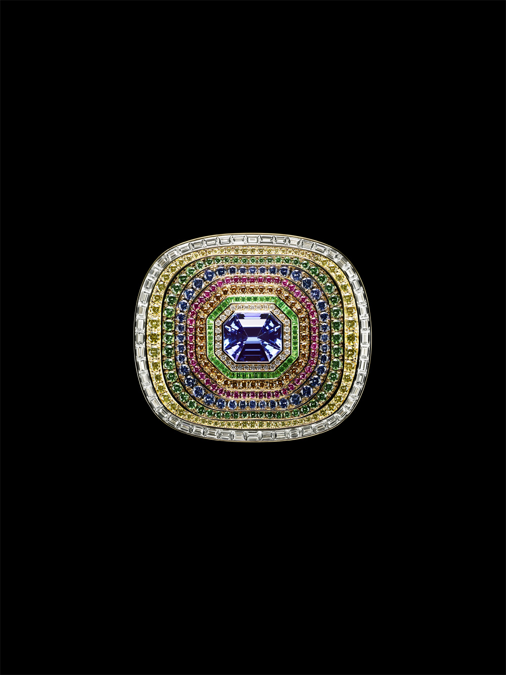色彩与几何形状之间彼此共鸣的概念,成为“色彩的肖像”一章中诸枚戒指的创作灵感。戒指以精妙的结构,展现各种出人意料的组合:红宝石在正方形中挥洒炽热朱红,绿柱石在三角形间吐露明媚黄色,蓝宝石透过圆形流淌悦目碧蓝……