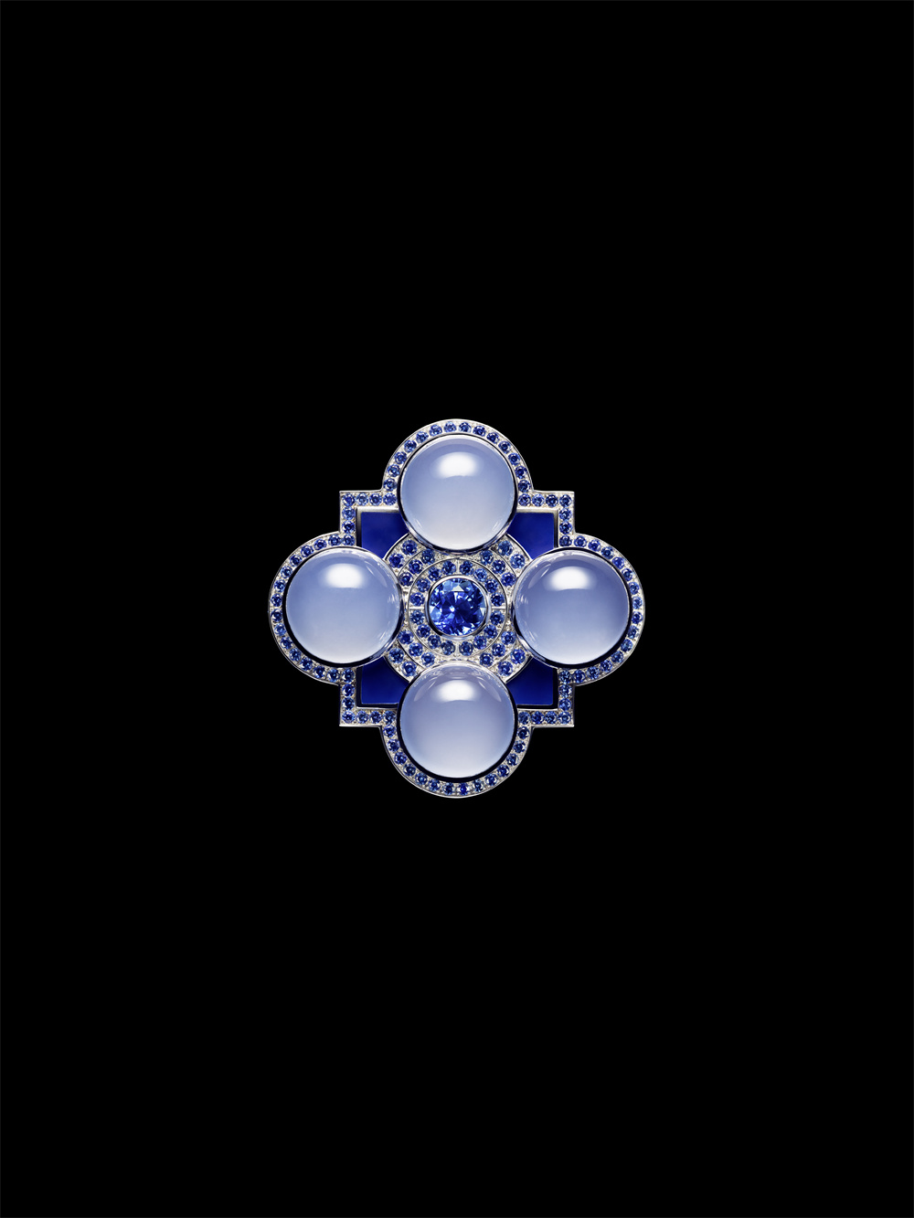 “流光溢彩”篇章的作品引人沉醉、珍雅高贵、极富建筑美感,且包含一款独一珍品项链。该篇章的每款作品都诠释着光波的衍射:透过金红石石英,只见黑色过渡到白色,缤纷的光线绚丽释放;而在石英上,还镶有一颗闪耀夺目的三角形切割钻石。