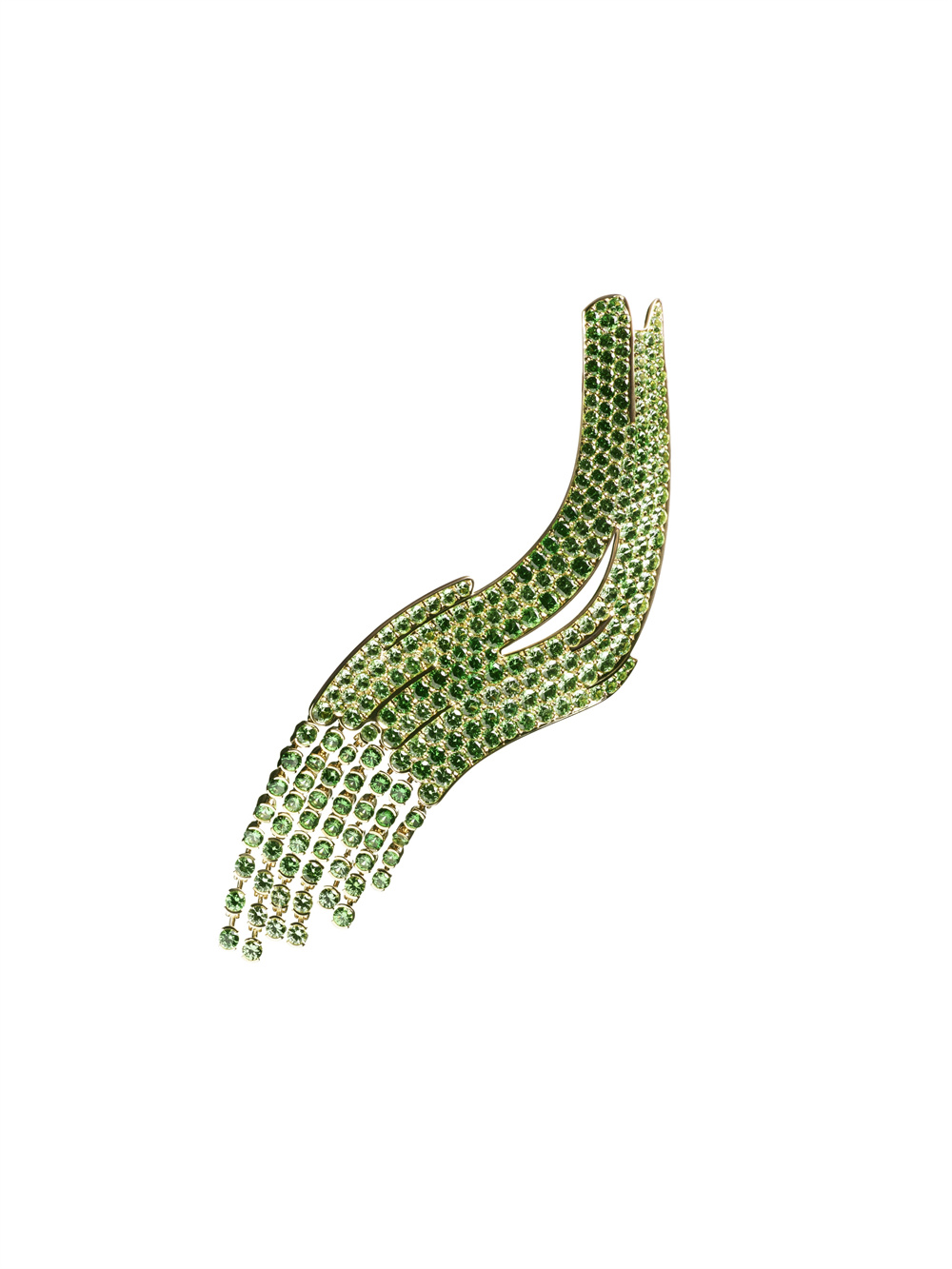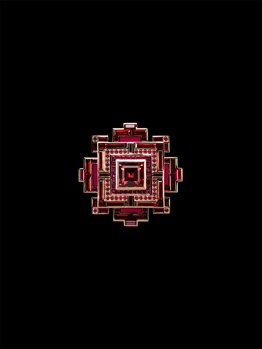在纯色线条的勾勒下,“彩笔生花”将一幅幻象搬上舞台,宝石恍惚间变作画笔;各种珍贵宝石与半宝石连成缠绕盘旋的花饰,映出层次分明的深邃颜色。精细入微的宝石充填工艺,成就别致的动感效果,并为珠宝赋予量感和质感。令人叹为观止的幻境就此成形。