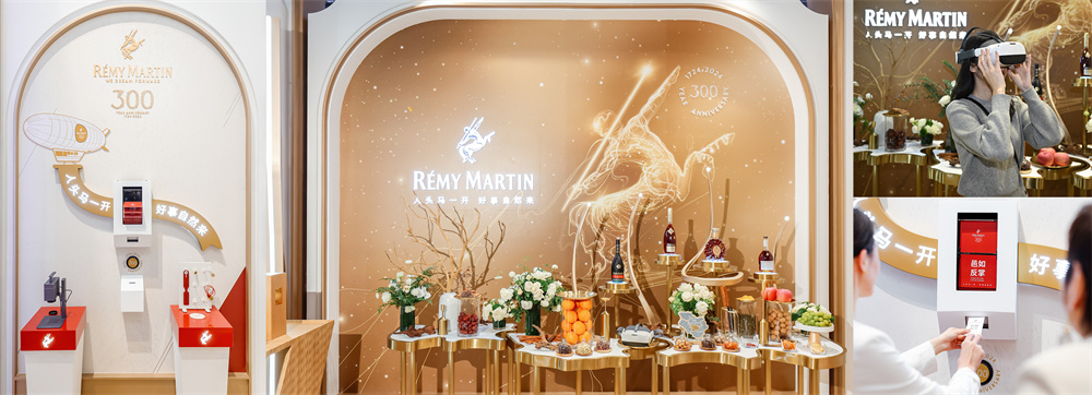 人头马展区,处处彰显品牌三百周年的璀璨荣光,于1724年至今的时间长河中标记重大里程碑的历史墙与创意陈列的众多干邑佳酿交相辉映,此前为三百周年庆典推出的“耀梦前行号”快闪互动装置也驶入进博现场,观众不仅可以通过vr体验展开穿越时空的干邑之旅,前往法国风土品鉴匠心,而且可以获得人头马好事代币进行游戏互动,赢取三百周年限定好事彩头。