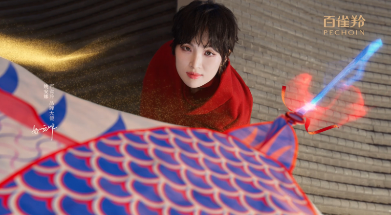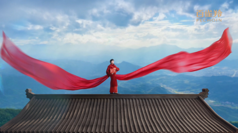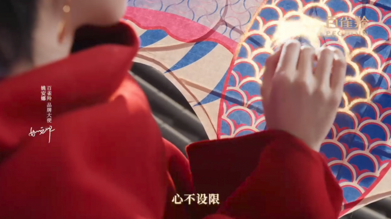 光影交错间,纸鸢飞入了百雀羚红色的新年礼盒中,成为了上面的纹样。姚安娜手抱礼盒站在房檐屋顶之上,巨幅红绸在身后随风舞动,仿佛一双翅膀,让她如鸢飞扬般满怀希冀地承载着新春心愿。这正与百雀羚的品牌调性不谋而合,在保留传统文化和工艺的基础上,永不设限,致力于将东方美学焕发新生,向世界传达中国美和国货品牌的持久生命力。