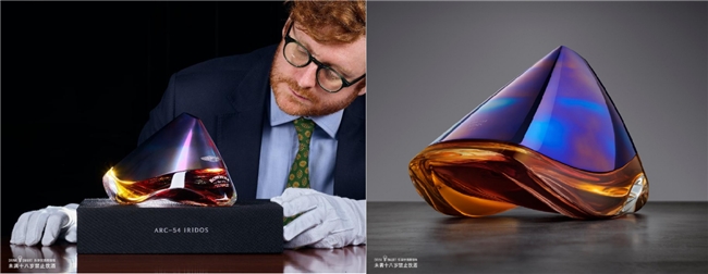 与此同时,“彩虹臻藏版(iridos edition)”之名源自“彩虹(rainbow)”和“彩虹色泽(iridescent)”两个拉丁词根的组合。酒樽顶部的钛金属采用与“战神”valkyrie超跑排气系统同源工艺锻制,由一块钛金属坯料加工,随后经历极端的冷热温度变化,在金属上形成了独特的彩虹蓝纹。