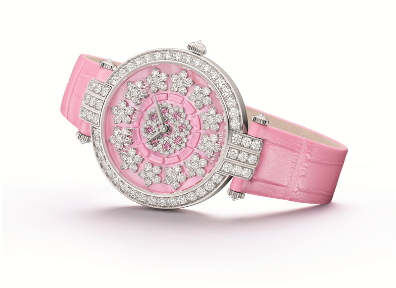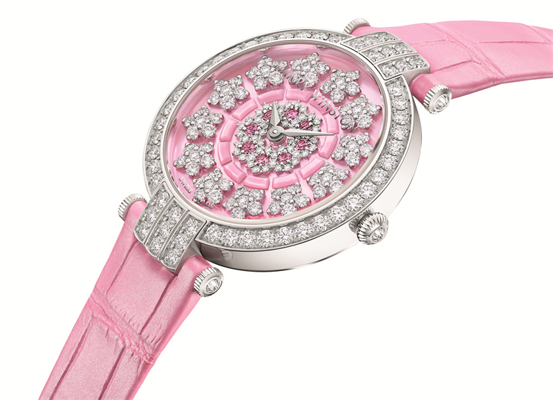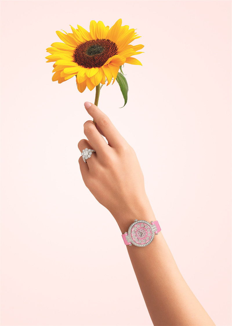 120颗圆形明亮式切工钻石和熠熠闪光的宝石,如同始终迎向太阳的的向阳花,从不同角度吸引光线,照亮整个设计。表盘备有醒目的粉色和翠绿色珍珠母贝款可供选择,表盘外圈饰有12朵由圆形明亮式切工钻石组成的闪亮向阳花,对应着12个小时。表盘中央是8朵娇小且同样闪耀的向阳花,花瓣上镶嵌着钻石和圆形明亮式切工粉色蓝宝石或祖母绿宝石。